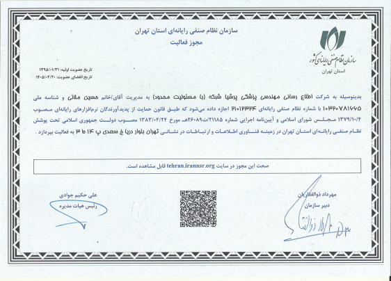 شرکت اطلاع رسانی مهندسی پزشکی پرشیا شبکه از تاریخ سی و یکم فروردین ماه سال نود و پنج با شماره نظام صنفی رایانه ای 21012324 در سازمان نظام صنفی رایانه ای استان تهران عضویت یافت.