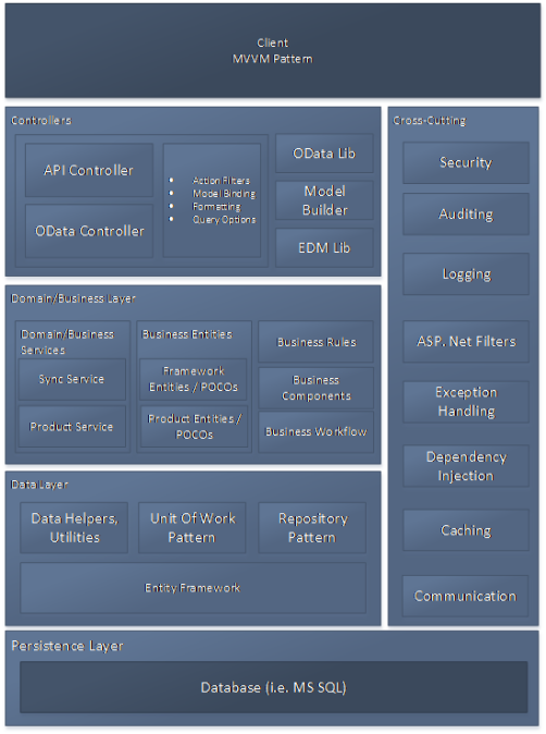 معماری لایه کلاینت MVVM بوده و لایه ارتباطی بین دیتابیس سرور (Odata Services) و دیتابیس کلاینت (Indexed DB) کتابخانه Jay Data می باشد.